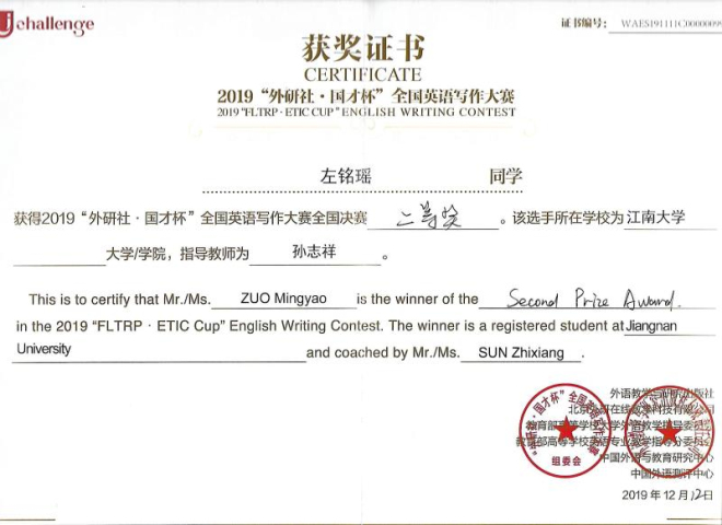 12月13日,2019“外研社·国才杯”大学生英语挑战赛(Uchallenge)于北京落幕。我校外国语学院左铭瑶同学荣获全国英语写作大赛总决赛二等奖。