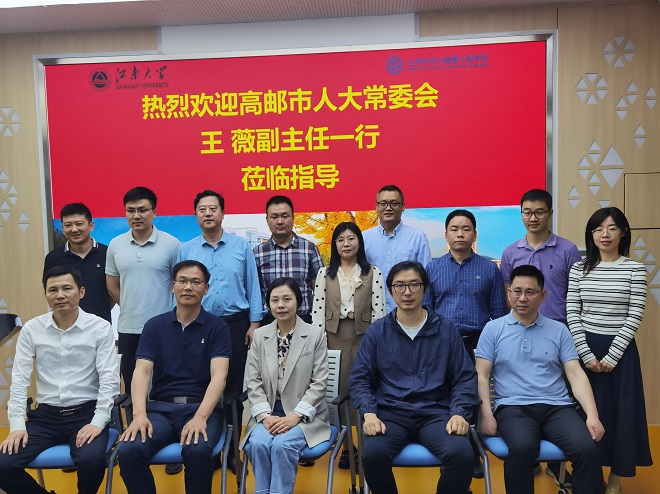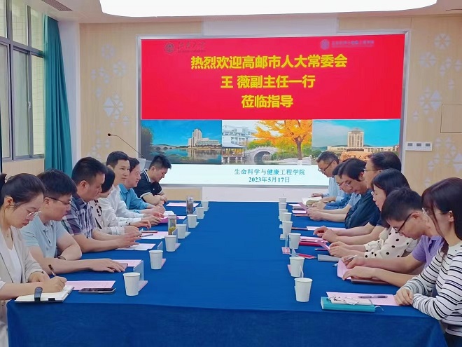 5月17日上午,高邮市人大常委会副主任王薇率队,高邮市人大科教文卫委主任李庆华、高邮经开区管委会副主任杨大忠、高邮市人社局副局长姜庆杰、高邮经开区管委会经发局局长张健等高邮市政企代表团一行赴生命科学与健康工程学院开展调研交流。生命科学与健康工程学院党委书记史志洪、院长尹健、副院长李会、教授史劲松及相关教师代表等出席会议。会议由李会主持。