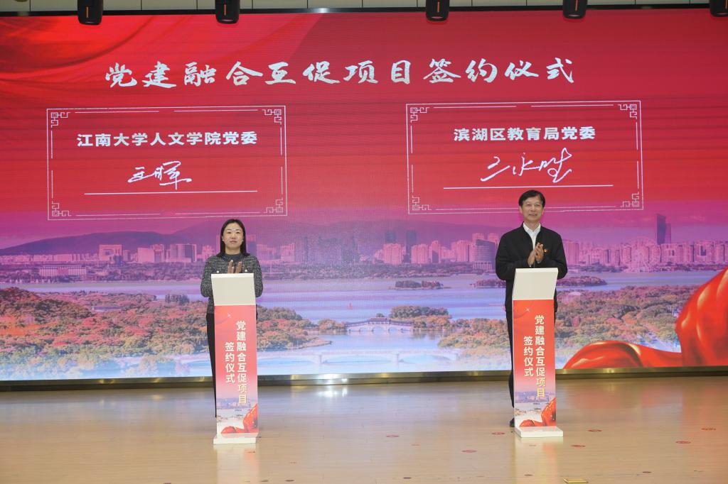 为促进高校与基础教育党建工作深度融合、资源共享、优势互补,江南大学人文学院党委与滨湖区教育局党委携手合作,王晖、王永胜共同签署了党建融合互促项目协议。王晖指出,项目以“资源共享、优势互补、协同创新、共同发展”为宗旨,聚焦党建引领下的“滨湖学校发展共同体”建设、共建教科研实践共同体、共育高素质教师队伍、共推江南文化传承创新四方面开展深入合作。她表示,双方将以此次签约为契机,通过实实在在的合作项目共建一批教学实践基地,共研一批教育教学改革项目,共育一批高素质专业化教师,将高校的智力优势转化为推动区域教育高质量发展的强大动力,共同推动教育领域党建工作迈上新台阶。