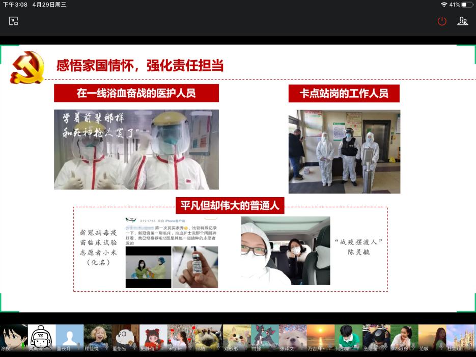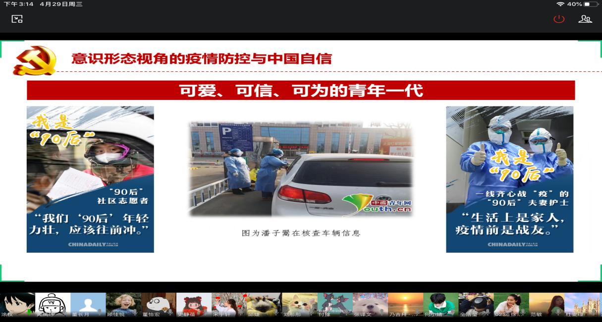 令人感动的是,在每个小组的汇报中都能看到一批活跃在家乡、社区疫情防控一线的大学生志愿者们的身影。他们帮忙测量体温、检查车辆、开办复工证明等等,为疫情防控贡献出自己的一份力量。正如习近平总书记在给北大援鄂医疗队全体党员的回信中提到的那样:“青年一代有理想、有本领、有担当,国家就有前途,民族就有希望。希望你们努力在为人民服务中茁壮成长、在艰苦奋斗中砥砺意志品质、在实践中增长工作本领,继续在救死扶伤的岗位上拼搏奋战,带动广大青年不惧风雨、勇挑重担,让青春在党和人民最需要的地方绽放绚丽之花。”