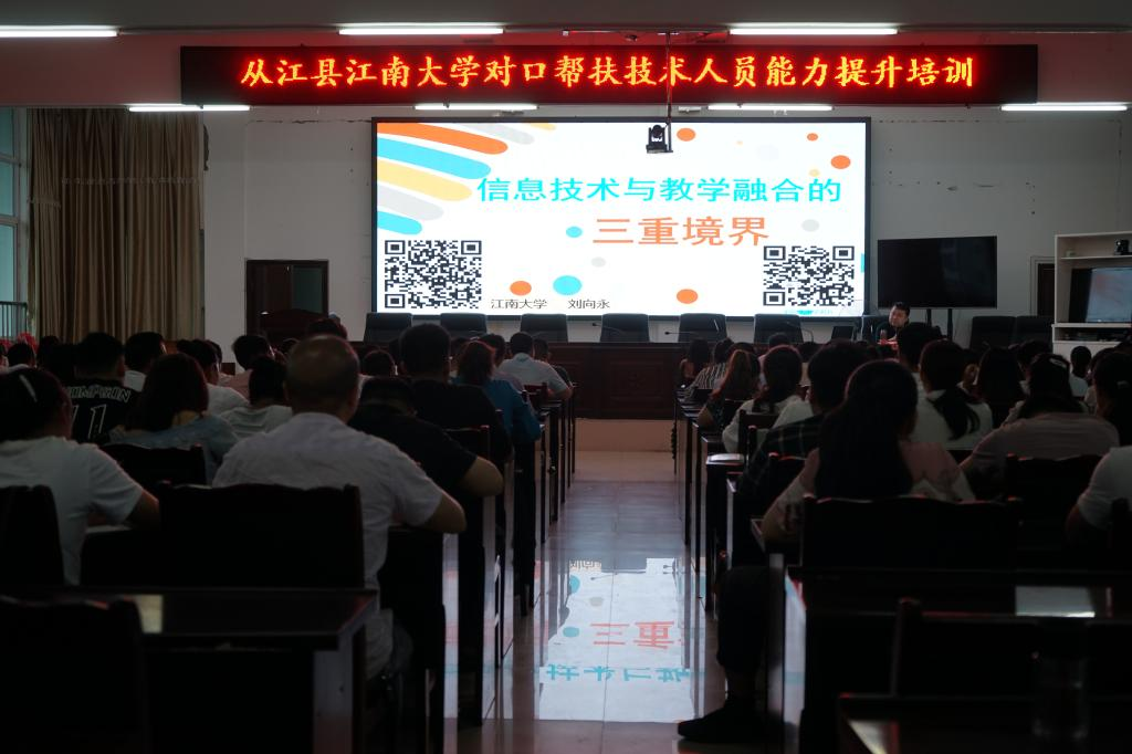 为深入贯彻落实教育部关于部属高校助力决战决胜脱贫攻坚的重大决策部署,根据学校统筹安排,5月28日,江南大学对口帮扶从江县技术人员能力提升班在从江县教育局开班。江南大学挂职干部、从江县委常委、副县长戴建明,从江县教育局副局长陆光华出席开班仪式。人文学院教育系徐兆洋副教授、教育技术系刘向永副教授分别为全体学员作了专题培训,拉开了从江扶贫培训项目序幕。从江县江南大学定点帮扶专班成员及从江县各乡镇150余名小学教师参加了培训。