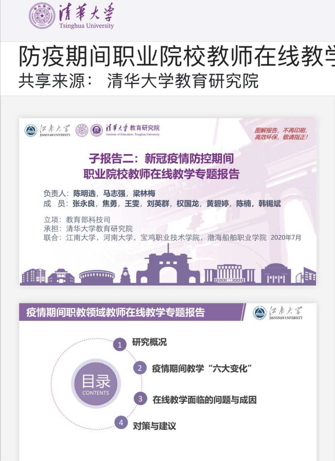 日前,由江南大学人文学院陈明选教授负责编制的《防疫期间职业院校教师在线教学专题子报告》在清华大学教育研究院正式发布。报告揭示了防疫期间职业院校教师在线教学的“六大变化”,分析了教师在线教学面临的问题与成因,提出了教师今后开展在线教学的对策与建议。编制组成员包括江南大学马志强副教授、权国龙副教授,河南大学梁林梅教授,宝鸡职业技术学院张永良院长,渤海船舶职业学院焦勇主任,清华大学王雯、刘英群、黄碧婷、陈楠等。