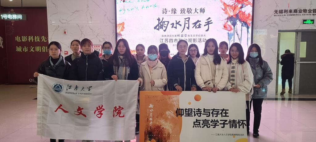 仰望诗与存在,点亮文化情怀。12月5日,江南大学人文学院国学社、人文学院边界文学社联合举办的叶嘉莹文学纪录片《掬水月在手》赏映特别活动在大世界影城举行。本次活动也是“诗• 缘丨致敬大师《掬水月在手》江苏四市联动观影活动”的系列活动之一,由中共无锡市委宣传部电影处与现代快报赞助。江南大学人文学院党委书记姚剑英、人文学院副院长杨晖教授、中文系张宇副教授受邀出席赏映活动,人文学院师生共60余人参加了此次活动。