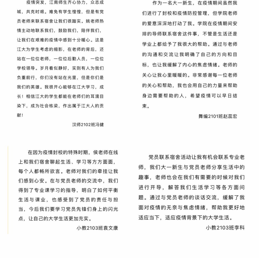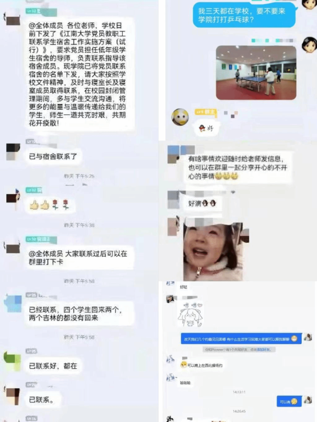 3月底,学院在明确工作要求和联系清单的基础上,并分别面向教职工党员和学生做了线上动员和部署,各教职工党支部、党员迅速响应,落实联系对接学生及宿舍。在疫情防控升级的特殊时期,教职工党员通过微信群、QQ群、企业微信群组与学生联系对接,关心学生学习生活状态。目前教职工党员已与宿舍及同学建立了联系,部分党员已通过多种形式与同学们开展活动,在学业、生涯规划、心理疏导、校园生活等方面给予指导与关怀,拉近师生关系。其中,学院党委书记姚剑英老师在进校值班期间走访联系宿舍,听取同学们对学院工作的意见和建议,王冰冰老师与同学们约好在疫情稳定后一起聚餐,张慧老师与同学们约定一起跑步健身……学生们也纷纷表示在与老师们的交流过程中感受到了来自学校、学院、老师的温暖与关爱。