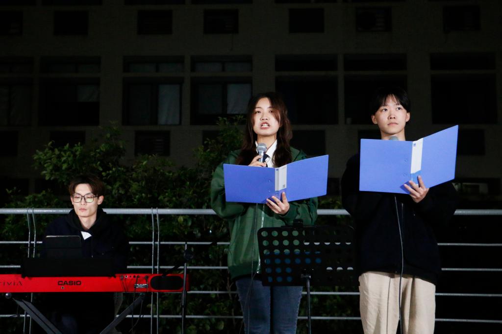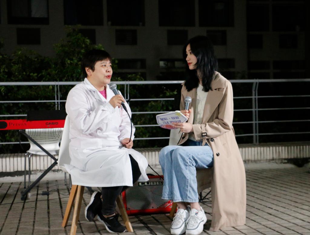 在本次演出致敬医护人员环节中,黄泳骐与徐坤同学共同朗诵了小教2003班刘晓媛同学为此次音乐会特地创作的诗歌《想什么》,向那些坚守在抗击疫情一线的医护人员献上最真挚的感谢与敬意。学生代表将汉师2001班李明洋同学精心创作的医护人员抗疫工作场景漫画作品和鲜花,献给在场的校医护人员代表,感谢他们的坚守与奉献。本次音乐会也邀请到了叶军与我们分享疫情防控工作中的主要工作内容与感人故事。通过倾听她的讲述,同学们深深地感受到了疫情防控工作的严峻与医护人员的艰辛。随后,同学们和医护人员共同演唱了《明天会更好》,将对未来的美好祝愿寄托于歌声。