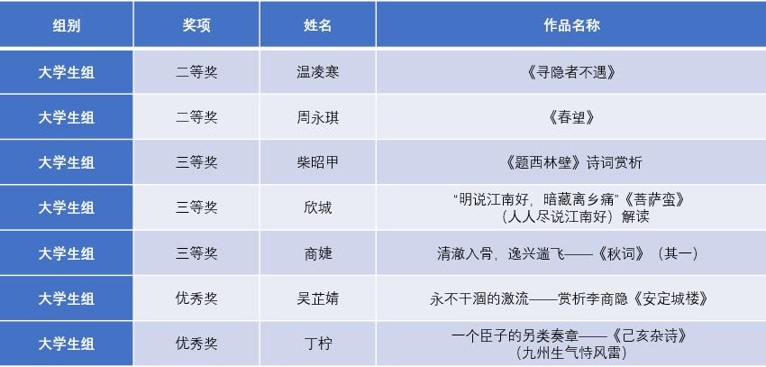 近日,由教育部、国家语委举办的第四届中华经典诵写讲大赛“诗教中国”诗词讲解大赛评选结果揭晓。通过初赛线上诗词素养测试、复赛微课录制、远程连线主旨演讲等环节的激烈角逐和综合比拼,人文学院提交的作品从全国各高校参赛作品中脱颖而出,共有7件作品获奖,其中二等奖2件、三等奖3件、优秀奖2件。