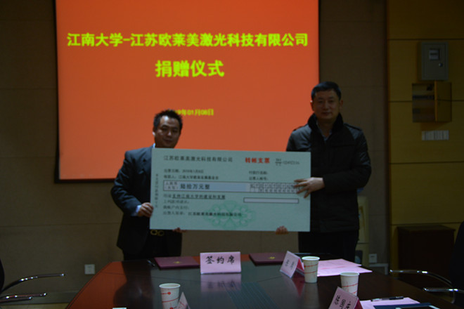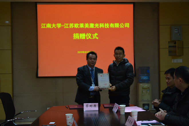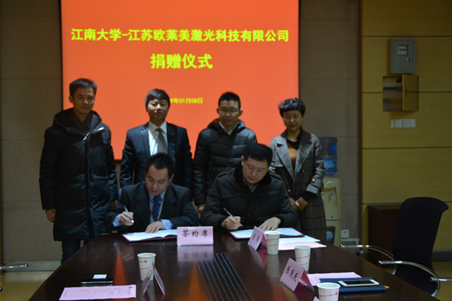 2019年1月8日上午,江南大学—江苏欧莱美激光科技有限公司捐赠仪式在钱伟长楼201会议室举行,江苏欧莱美激光科技有限公司副总经理李丰、副总经理罗剑,校社会资源处处长黄敏、理学院党委书记王珏、院长陈国庆出席了签约仪式。仪式由江南大学理学院副书记、副院长陈周主持。