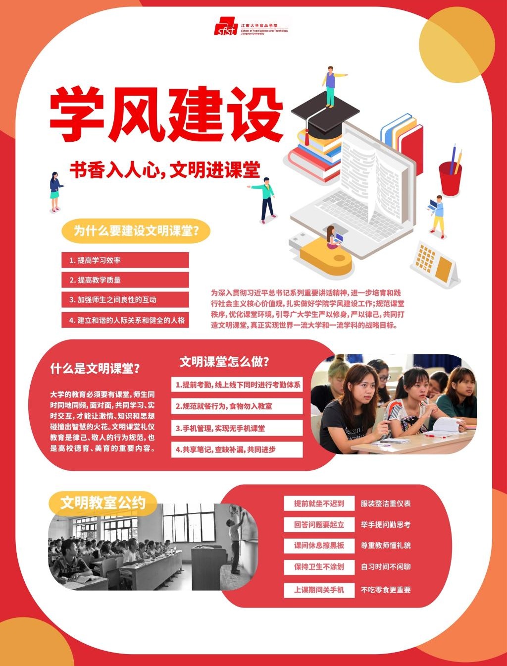 学院向全院同学发出倡议,号召建设文明课堂。食品学院分团委、学生会、研究生会凝聚力量,制定文明教室公约,通过线上、线下等渠道进行宣传,号召同学们做到“增强时间观念,杜绝迟到早退;规范就餐行为,食物勿入教室;强化纪律意识,提高课堂质量;争做文明模范,不留一片垃圾”,营造了浓厚的文明课堂建设氛围。