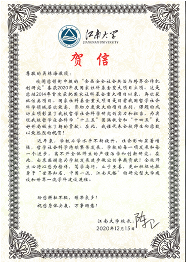 近日,商学院吴林海教授领衔申报的“食品安全社会共治与跨界合作机制研究”课题喜获2020年度国家社科基金重大项目立项,这也是吴教授2014年获批国家社科基金重大项目以来再次获批该类项目。
