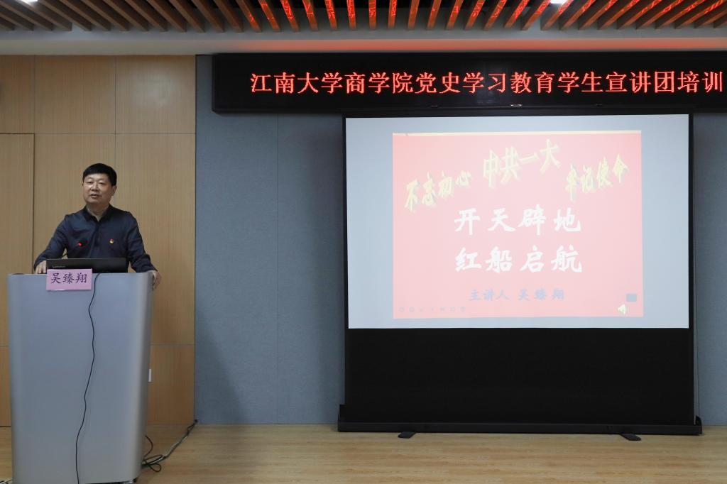 随后,吴臻翔为同学们带来了一场声情并茂、生动精彩的党课。吴臻翔以“什么是中国共产党”开场,引发同学们思考,展开了以“追忆建党光辉史,坚定信念跟党走”为主题的党史教育培训。他详细介绍了中共一大的开展过程以及13位参会党员的未来去向,并以快书、歌唱的方式辅助讲解了雷锋、焦裕禄的故事,赞颂了他们为人民服务的伟大精神。正是“南陈北李”在黄包车上的约定孕育了中国共产党这颗生机勃勃的种子,中国共产党的初心从未改变,就是实现中华民族的伟大复兴,为中国人民谋幸福。最后,他还向宣讲团成员们分享了自己多年的讲课经验,他强调不仅要学习书本知识,也要注重思考实践,在实践中增强宣讲能力,不断磨练推敲宣讲方法。