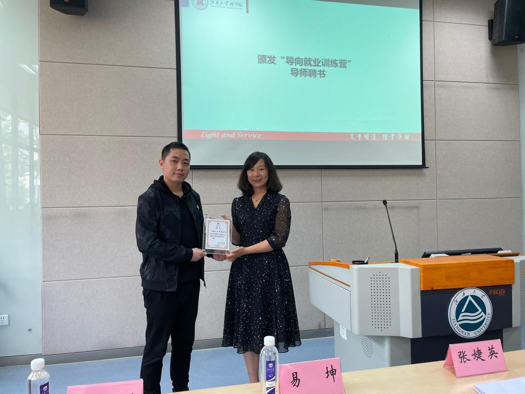 张婕英副处长为易坤校友颁发“导向就业训练营”导师聘书