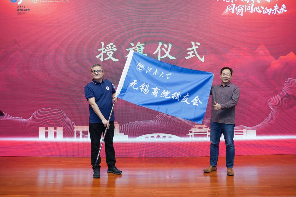 在嘹亮的江南大学校歌声中,大会拉开帷幕。校友会筹备组代表谢玉山汇报大会筹备情况。林云鉴宣读、大会审议通过了首届无锡商院校友会组织机构成员名单,周云龙向新当选会长吴建民颁授会牌,林云鉴向首任秘书长谢玉山颁授会旗,周云龙、刘长青、林云鉴、徐静、徐昉等参会领导分别为组织机构成员颁发聘书。