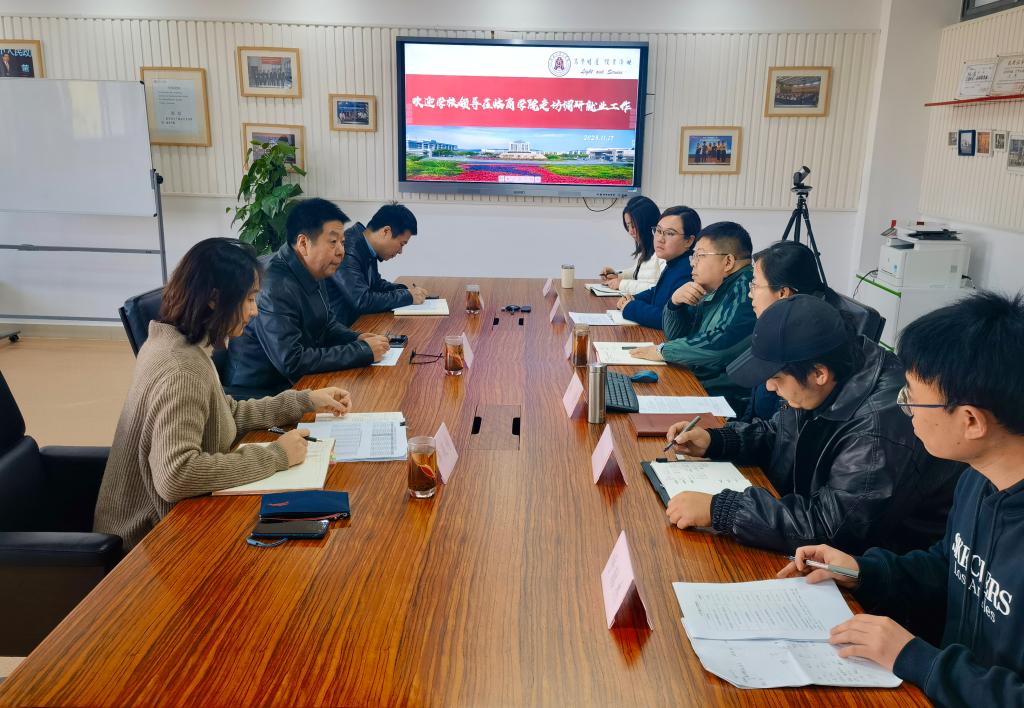 11月17日上午,校党委常委、副校长倪松涛,党委学生工作部部长周伟涛,就业指导中心主任兼学生工作处副处长单筱婷等一行莅临商学院调研学生就业工作,商学院党委书记刘长青、党委副书记兼副院长徐静、学工办及MBA教育中心就业负责人参与座谈。