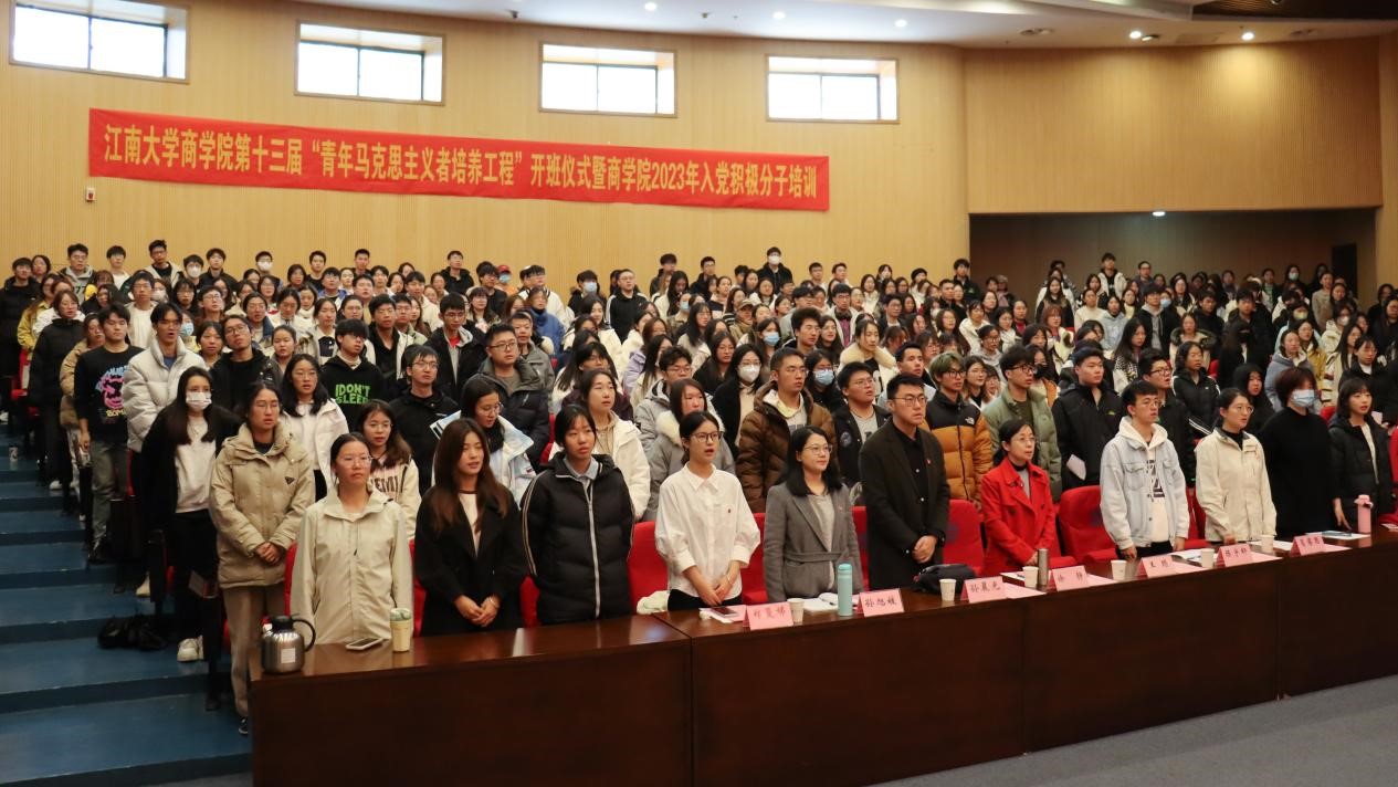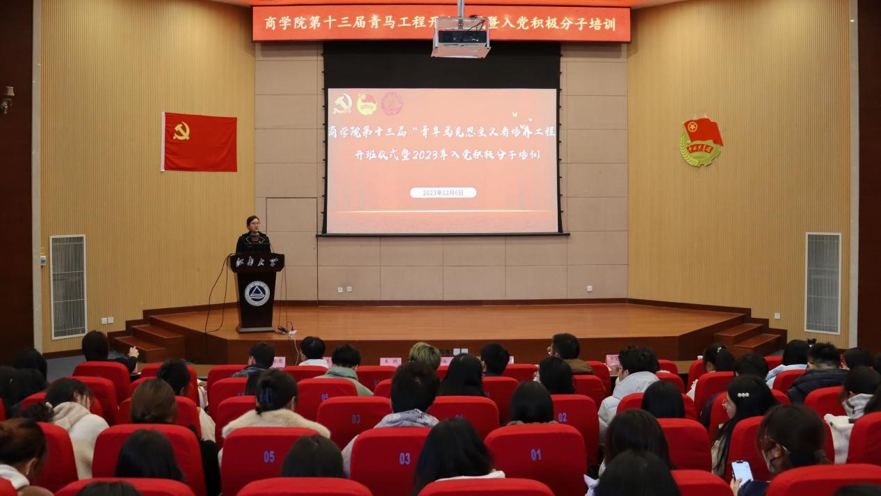 为深入学习贯彻党的二十大和团十九大精神,扎实推进“青马工程”实践育人工作,12月6日下午,商学院第十三届“青马工程”开班仪式暨2023年入党积极分子培训在远东报告厅举办,学院党委副书记兼副院长徐静、马克思主义学院副教授孙晨光、学院学工办副主任孙旭媛出席仪式,培训班学员和入党积极分子共计300余人参加。活动由学院分团委书记王璁主持。