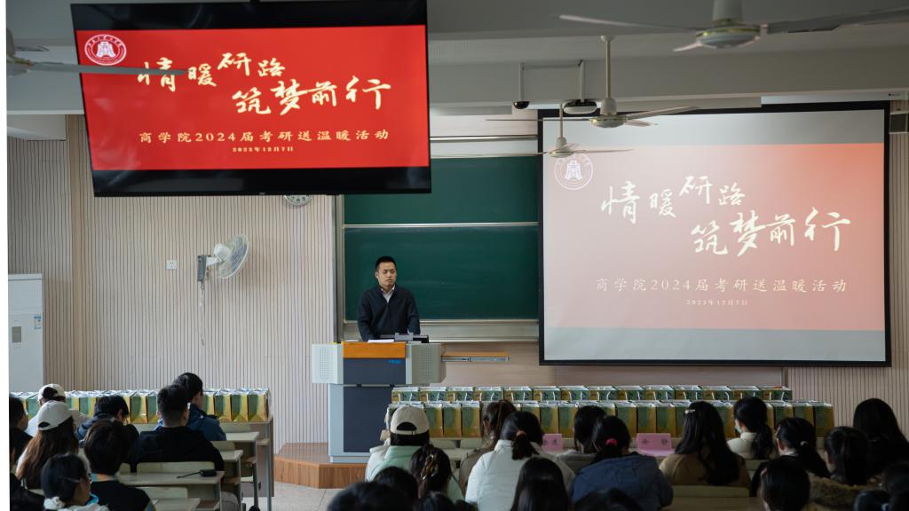 逐梦正当时,研路绽芳华。2024届考生考研进入倒计时,为帮助考研学子们稳心态、增信心、添动力,做好备考最后的冲刺,商学院于12月7日下午在第二教学楼举办“情暖研路,逐梦前行”商学院2024届考研送温暖活动。学院领导给予高度重视,商学院院长浦徐进、院党委副书记兼副院长徐静出席本次活动,与毕业年级辅导员、各班就业信息联络员一起,为即将考研的同学送去暖心的鼓励与美好的祝福。