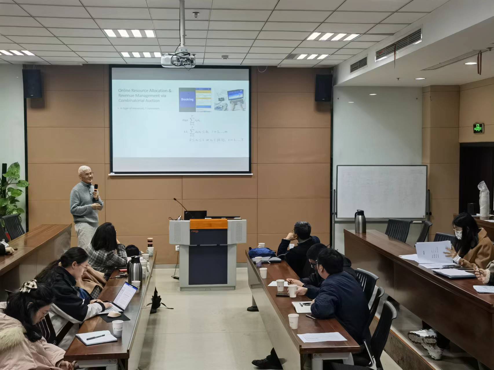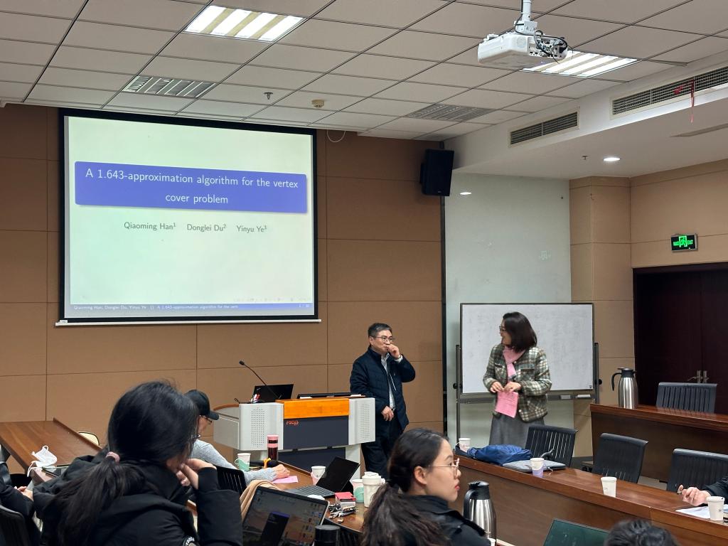 近日,商学大讲堂系列学术讲座第234讲在商学院116东方厅会议室举行。现任斯坦福大学管理科学与工程系及计算数学工程研究院李国鼎讲座教授叶荫宇教授和南京工业大学韩乔明教授应邀分别作题为“竞价市场的在线线性规划学习算法设计与分析”“点覆盖问题研究”的学术讲座。讲座由管理科学与工程系程郁琨教授主持,商学院管工系教师、管理科学与工程、物流工程与管理、工业工程与管理的研究生聆听了本次讲座。