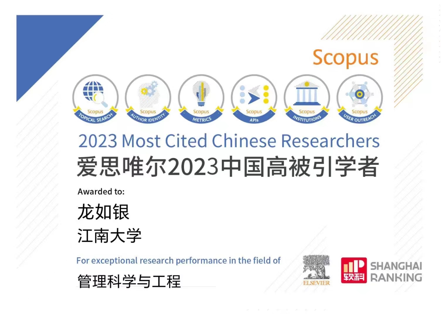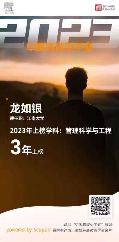 在本次高被引学者名单中,江南大学共计入选24人。其中商学院龙如银教授作为管理科学与工程学科的高被引学者入选该榜单!这也是龙如银教授继2021年入选后,连续3年入选“中国高被引学者”榜单!