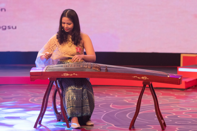 我校泰国籍留学生李玉兰以“古筝缘,中国情”为题,斩获二等奖(第4名)。她与古筝的初遇,缘于五年前在家乡听到的一场中国音乐会,一曲优雅的古筝独奏使她魂萦梦牵,继而拜师学艺。自此,仿佛东风吹开了一扇大门,李玉兰深深爱上了美丽的中华文化,并在三年前只身来到中国,开启留学江南的时光。李玉兰精彩细腻的演奏、饱含深情的独白,深深地打动了在场的评委和观众们。