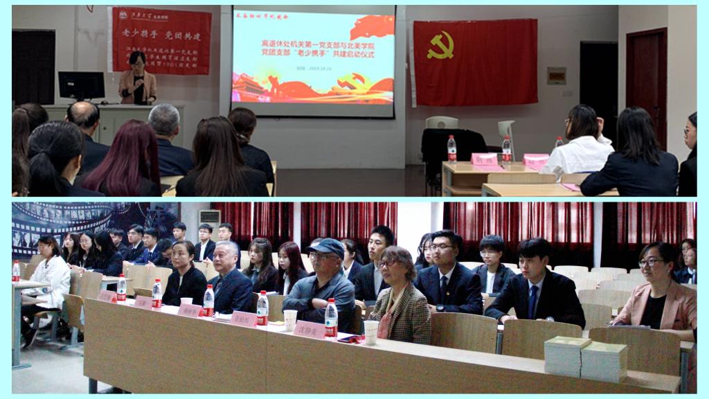 2019年10月24日下午,江南大学离退休处机关一支部与北美学院学生党团支部“老少携手,党团共建”启动仪式在北美学院206会议室举行。出席本次活动的嘉宾有江南大学关工委副主任吴骥一、离退休处机关第一党支部书记蒋仲华、支委袁伯兴、学院关工委委员沈静炎、国际教育学院与北美学院党委书记高雪梅、副书记副院长荆燕。国际教育学院与北美学院学生国贸酒店党支部全体党员,北美学院国贸1801团支部全体同学出席了启动仪式。