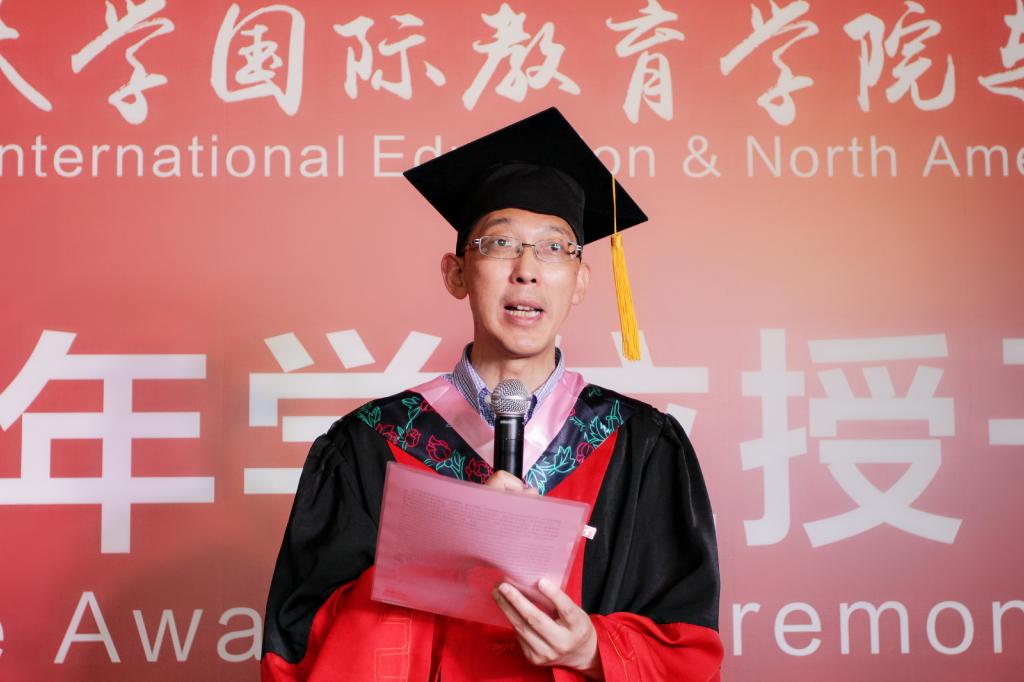授予仪式在庄严的中华人民共和国国歌声中拉开序幕。院长龚晓斌教授首先致辞,他代表学院对国际教育与北美学院2020届所有毕业生表示衷心的祝贺,充分肯定了大家通过努力取得的成长和进步,在2020这个特殊的年份,学院提出并将“国际视野、未来思维、江南情怀”作为学院发展的愿景,他勉励所有毕业生也将此作为个人未来发展的理念:国际视野要求大家基于不同的政治制度、伦理价值、宗教信仰、文化心理等碰撞,建立互信、共赢的人类命运共同体,培养跨文化沟通能力;未来思维要求大家从历史逻辑、理论逻辑、实践逻辑来认识世界和改造世界;江南情怀要求大家以江南之山水文化、工商文化、创新创造文化中汲取营养,在态度上做到包容、开放、欣赏,在情感上做到积极、理解、接纳,在方式上做到多元、双向、互动,牢记“笃学尚行、止于至善”的校训,以“和平、发展、合作、共赢”为旗帜,成为新时代人类命运共同体的建设者和推动者。