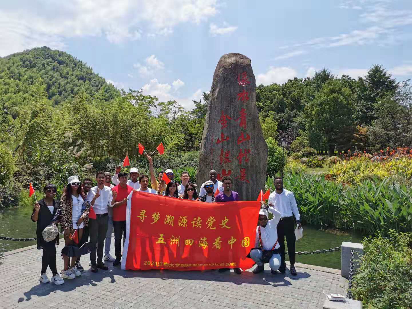 为积极响应习近平总书记关于国际学生“读懂今天的中国,必须读懂中国共产党”的号召,带领优秀国际学生走进中国的山山水水、厂矿社区,深入了解中国共产党领导下的革命、建设、改革成就,感受最真实、最全面、最立体的中国,7月19-20日,由来自也门、巴基斯坦、孟加拉国、尼日利亚、利比里亚、卢旺达、吉布提、索马里、刚果(布)、古巴等10个国家的18名学生组成的“读党史,看中国——江南大学国际学生2021暑期社会实践团”前往浙江省嘉兴市和安吉县开展了一场极富教育意义的中国国情观察实践活动。