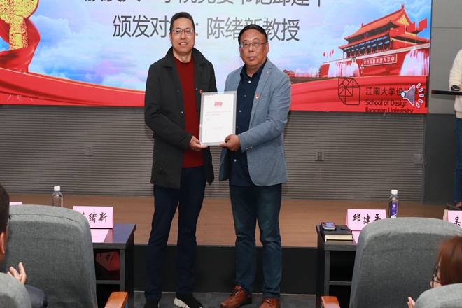 活动第一篇章“建队伍”,学院成立“学四史”读书班,邀请陈绪新作为学读书班授课导师“领读”四史;邀请学生党支部书记作为“学四史”读书小组组长“带头读”四史,邱建平指出:“正值世界读书日,设计学院组织成立四史读书班,要努力把阅读的境界升华为‘悦’读。”他勉励在场师生要多读书,读好书,走好路,以美为媒,增强文化自信。会上,邱建平为陈绪新颁发设计学院“学四史”读书班授课导师聘书。邱建平、王晖共同为学生党支部书记颁发设计学院“学四史”读书小组组长聘书。