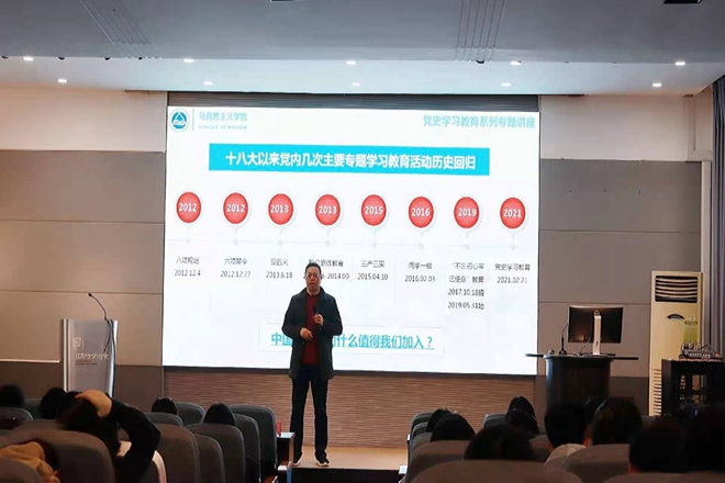 活动第三篇章“听报告”,陈绪新做了一场题为“中国共产党百年辉煌的奋斗进程及其历史经验”的专家党史报告。他以引用列宁的名言“忘记历史就意味着背叛”入手,明确学党史的重要性。他认为人类的发展历史就是一部设计史,“人是设计的灵魂”,强调设计应为民服务,回应时代关切。陈绪新紧扣“为什么要加入中国共产党”这一问题,系统梳理中国共产党在新民主主义革命时期、社会主义革命和建设时期、改革开放和社会主义现代化建设新时期所取得的伟大成就。通过穿插讲述党史人物事迹,陈绪新带领全场师生共同回顾中国共产党百年奋斗的光辉历程和历史贡献,让所有师生都感触到党的温度与革命英烈的崇高精神。同时,他结合时代热点,阐述马克思主义的先进性,归纳习近平总书记关于党的历史的重要论述,呼吁每个中国人都要传承红色基因,坚守初心,牢记党史,继承发扬革命先辈的崇高精神,为实现中华民族伟大复兴的中国梦接续奋斗。陈绪新的党史报告内容丰富、脉络清晰、发人深省,全场不时响起阵阵掌声,让在座师生进一步坚定理想信念、增强党性修养、强化使命担当。