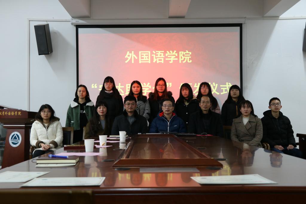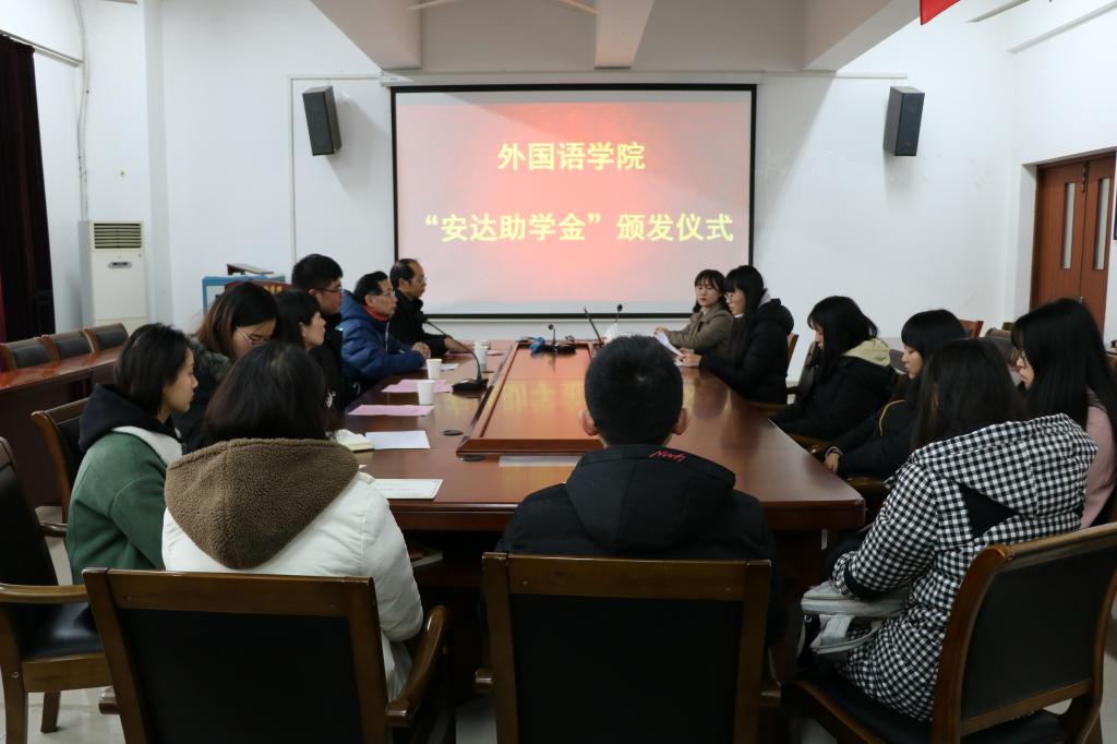 2019年1月15日下午,江南大学外国语学院“安达助学金”颁发仪式在外国语学院楼会议室A349举行。学院党委书记黄城芳、党委副书记刘伯贤、负责学生资助工作辅导员张圆、英语1701班班主任胡燕萍、无锡滨湖安达汽车综合性能检测有限公司陈志刚先生,以及获助学金的10位同学出席仪式。仪式由院分团委副书记张圆主持。