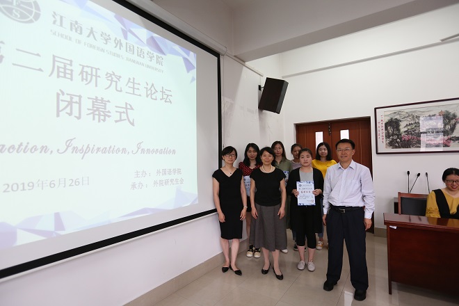 随后,朱义华宣读优秀论文评选结果,在座导师和学院领导共同为获奖同学颁奖并合影留念。本届论坛获奖名单如下(按拼音顺序):一等奖:白雅冰、王籽运、吴佳;二等奖:李月杉蔓、王雅琴、项蓉、赵凯琪、周泽宇;三等奖:王童、吴吉星、张倩瑶、张瑜、郑童。随着颁奖典礼的结束,外国语学院第二届研究生论坛也圆满落下了帷幕。