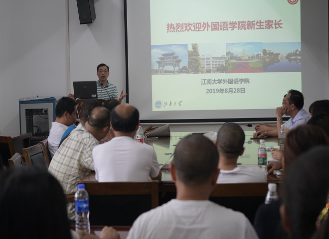 会上,黄城芳书记首先介绍了江南大学及外国语学院的发展历程和基本情况,然后围绕学生的思想与生活对家长提出了三点希望和要求:一是加强对孩子的思想教育,家校要形成合力共同教育,不仅关注孩子的成绩更要关心孩子的身心健康;二是始终关心孩子的学习和生活,大学不是“保险箱”,作为家长要了解孩子的学习状况,积极鼓励孩子升学考研;三是教育孩子遵守校规校纪,红线、底线不能碰,学生要严格遵守学校的规章制度。接着,方文开院长以“来江南遇见更好的自己”引出了话题。方院长主要从学院建设发展、师资力量情况、学科建设与成效等方面为家长进行详细介绍,在与家长互动环节,方院长更是从专业学习的角度为学生家长进行解答。最后方院长鼓励学生要为自己设立学习目标,并不断努力,一步一步实现自己的目标。