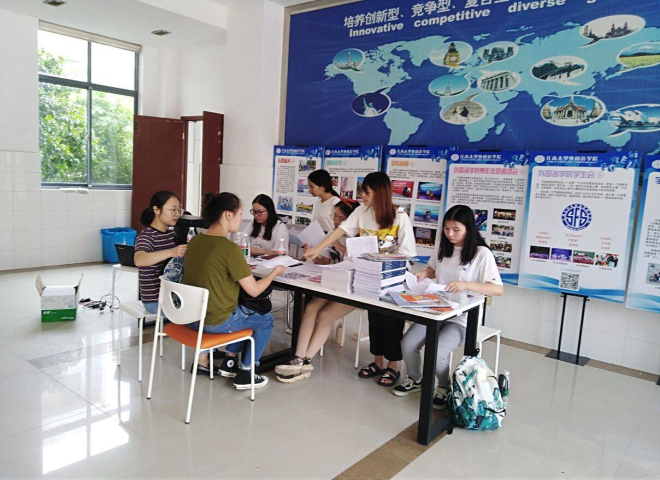 2019年9月5日7点,久雨初霁的早晨洋溢着喜迎新同学的氛围。外国语学院大楼一楼早已布置一新,刘伯贤副书记、朱义华副院长和分团委书记杨艳老师与外院研会的同学们早已在此等候,准备迎接2019级研究新生的到来。