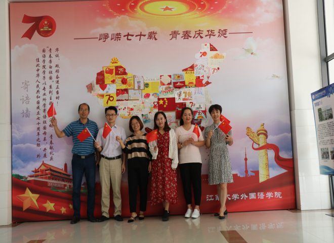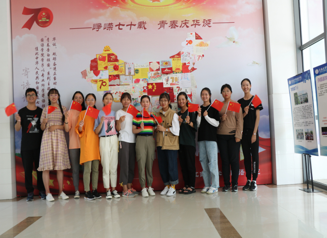 青春献礼庆华诞,砥砺奋进正当时。在中华人民共和国成立七十周年之际,外国语学院师生在国庆节来临之际通过系列活动以青春告白祖国。心中有大爱,心向中国红,外院师生与国旗合影,与国旗同在,以实际行动书写青春华章,祝福祖国繁荣富强。