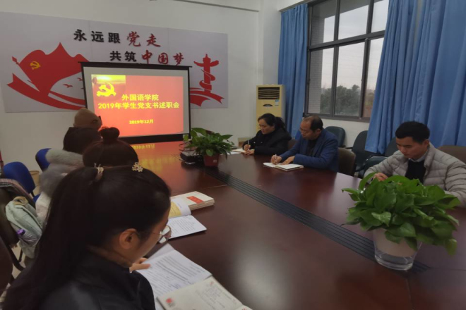 为深入开展“不忘初心、牢记使命”主题教育,全面总结2019年外国语学院学生党建工作,落实全面从严治党要求,2019年12月18日下午16点,各学生党支部书记在A425会议室组织进行2019年度学生党支部书记工作述职工作会议。党委副书记刘伯贤,分团委书记杨艳,辅导员苗文建出席本次会议。本次会议由党委副书记刘伯贤主持