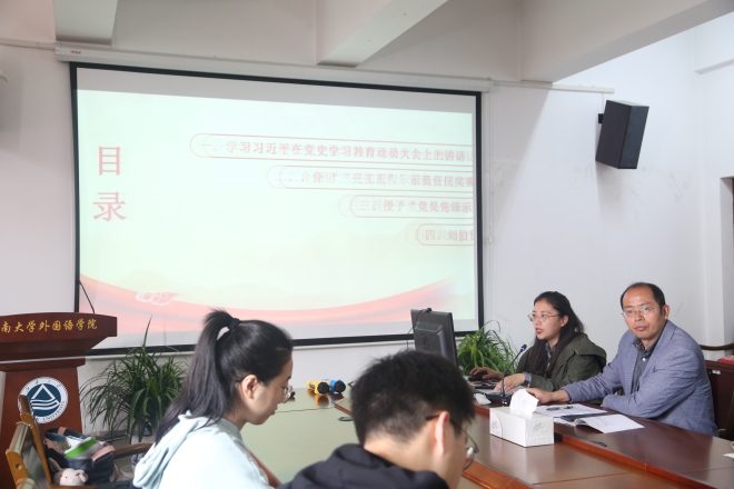 在中国共产党建党100周年即将到来之际,为充分发挥中共党员先锋模范作用,增强党支部战斗堡垒作用,外国语学院于4月16日上午在文科楼A349召开党员先锋示范岗创建暨党史报告会。全体本科生、研究生党员参加了本次会议。外国语学院党委副书记刘伯贤、分团委书记陆芳出席会议,会议由陆芳主持。