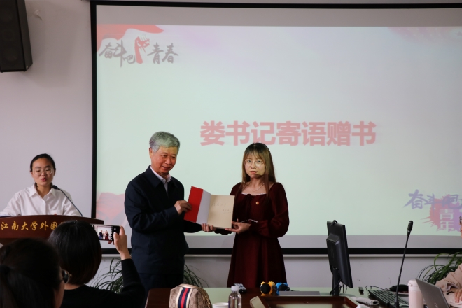 最后由娄国栋分享了自己的入党初心和故事。娄国栋自1973年3月5日入党,工作期间与青年为友,全心致力于学生工作。他强调了青年人的时代责任与历史使命,青年大学生要重视大学时期,将自己的初心和使命体现在日常的学习生活中。娄国栋说,本次团课可以激发学生们的内在动力,发展自我,奉献自我,发挥青年人的作用。“青春是人生最好的阶段,青春的精神应永远保留,青春万岁。”最后,娄国栋向英语1904团支部赠书《习近平的七年知青岁月》,让时代青年感受习近平总书记青春时代的力量。