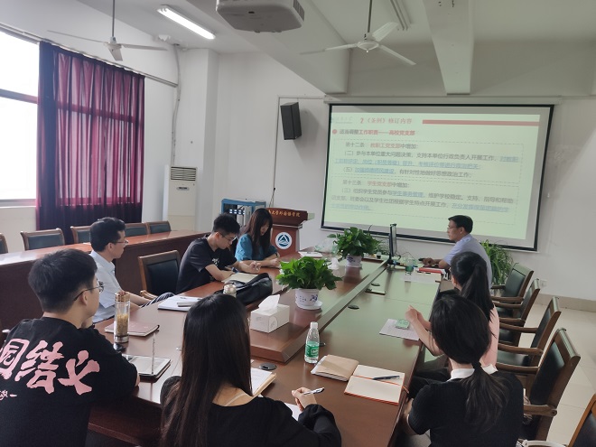 会上,史志洪首先重点解读了《中国共产党普通高等学校基层组织工作条例》。他指出,《条例》的修订和实施,对于全面贯彻党的教育方针,落实立德树人根本任务,建设高质量教育体系、建设教育强国,具有重要意义,全体党支部要认真学习、遵照执行。史志洪还领学了《江南大学教职工政治理论学习实施细则》《外国语学院支部工作年度考核方案》,要求支部在学院工作中发挥更重要的作用,以考核促党建。史志洪还指出,本次会议是《中国共产党普通高等学校基层组织工作条例》出台后,外国语学院组织的首次支部书记例会,今后学院将在固定时间召开例会。