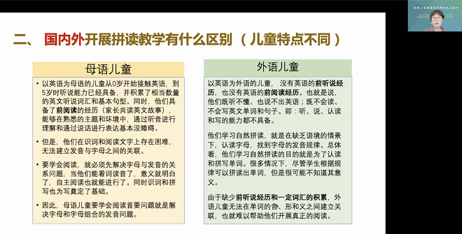 美国杰克逊州立大学教育学博士、集美大学外国语学院教授、外语教师教育与发展研究所所长张海燕教授的话题为《小学英语教学中语音意识的培养》。她首先介绍了语音意识的定义及其构成要素,强调了它在自然拼读和语言学习中的重要性。通过具体实例的拼读教学演示辨析了一系列语音学术语。同时,她分享了美国课堂中提高学生语音意识的方法,为我国教师开展自然拼读教学提供了启示。