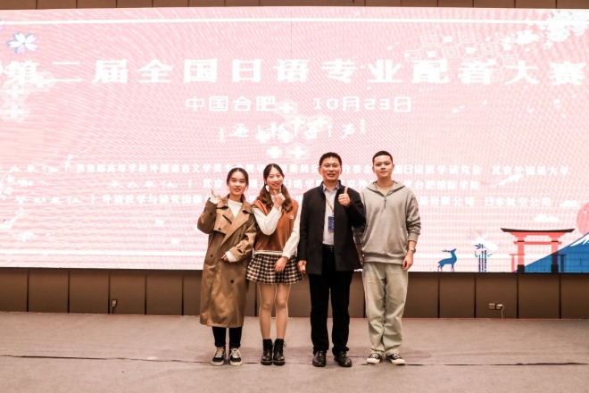 10月23日由教育部高等学校外国语言文学类专业指导委员会、中国日语教学研究会与北京外国语大学共同举办的国家级外国语言类高级赛事——“第二届全国日语配音大赛”在安徽省合肥市举行。我校外国语学院日语系18级学生赵可颖、李澳、姜焱等三位同学努力拼搏,最终斩获该项赛事的三等奖。这是我校第一次参加此类赛事并获佳绩。