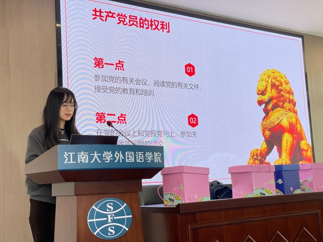 “党务知识讲解”环节,分别邀请了文学方向研究生党支部书记张羽洁、语言学方向研究生党支部书记刘澍蕾和英语2101团支部书记柏晶作为主讲人,围绕入党流程、党员权利及义务、“两会”热词等方面,向同学们进行了全面的介绍。