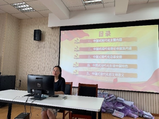 为深入学习贯彻习近平新时代中国特色社会主义思想,推进主题教育走深、走实、走心,引导党员深刻领会中国式现代化的内涵和意义,深刻领悟、贯彻党的二十大精神,6月7日下午,外国语学院副院长谢竞贤为拓展部党支部全体党员讲授了题为《以中国式现代化全面推进中华民族伟大复兴》的主题党课。