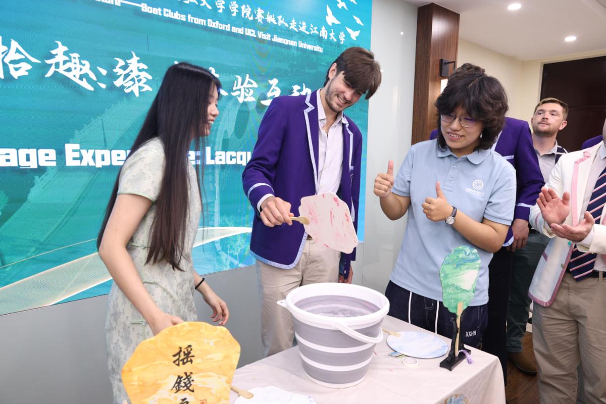 文明互鉴:在互动中加深理解。在文化体验环节,中外学生共同参与了非遗漆扇绘制,在指尖流淌的色彩中留下跨文化的美好记忆。随后,双方互赠校园文创产品,以独具特色的纪念品传递友谊。无锡市人民对外友好协会还为学生代表准备了特别礼物,现场氛围温馨而热烈。