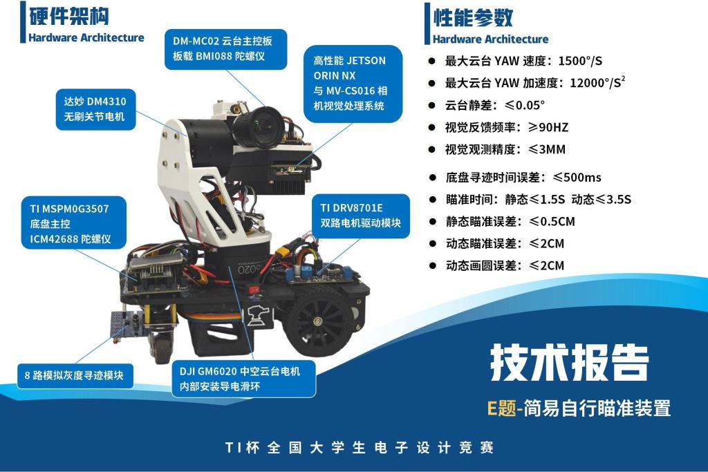 江南大学参赛队选择的E题要求设计制作一个简易自行瞄准装置,包含自动寻迹小车与瞄准模块两大核心部分。团队以MSPM0G3507为主控芯片,结合八路灰度传感器与陀螺仪数据,借助DRV8701驱动实现精准循迹。视觉系统采用高分辨率相机与边缘AI模块,通过CUDA加速实现高帧率、高抗干扰的目标识别;瞄准云台创新融合陀螺仪与双无刷电机,确保操控过程的稳定性。该系统性能表现卓越,静态瞄准时间小于1.5秒,动态瞄准时间小于3.5秒,误差分别控制在0.5厘米与2厘米以内,动态追踪性能尤为出色。作品凭借优异的指标与流畅的演示,赢得了评审专家的一致认可,最终摘得本科组“TI杯”。