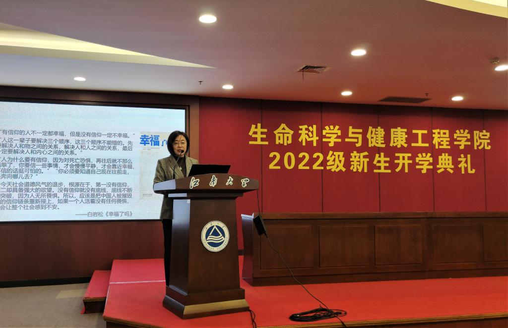 随着国庆节后最后一名新生返校,10月7日下午,生命科学与健康工程学院2022级全体新生线下大团圆,欢聚一堂,在图书馆510多功能厅举行2022级新生开学典礼。学院党委书记陈霞雯、院长陈敬华、常务副院长尹健、副院长李会、副院长吴静,制药工程系副主任闻建、药学系副主任周娟,学院教授代表及新生班主任出席了本次活动。开学典礼由学院党委副书记兼副院长蒋艳主持。