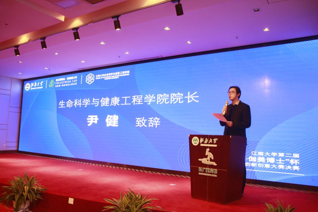 决赛伊始,尹健致辞。他对关心支持学校学院建设发展的企业贤达表达了衷心感谢,希望以此次校企合作共办比赛为契机,合力突破行业核心技术,实现科研成果转化,进一步开拓青年学子们的学术视野、增强创新意识、提升实践能力,达到优势互补、资源共享、互利共赢的目的,为健康中国、美丽中国做出努力。