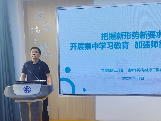 生命科学与健康工程学院院长尹健通报了教育部公开曝光的违反教师职业行为十项准则的典型案例,进行警示教育。希望大家引以为戒,警钟长鸣,自觉遵守师德师风的各项规定和要求,做到内化于心,外化于行,坚守三尺讲台,潜心教书育人,严格落实师德师风是评价教师队伍素质的第一标准。随后,尹健就人才培养、师资队伍、科学研究与社会服务等方面对标五年任期目标责任书的相关要求进行了任务解读,希望广大教职员工凝心聚力,发挥优势,共创辉煌。