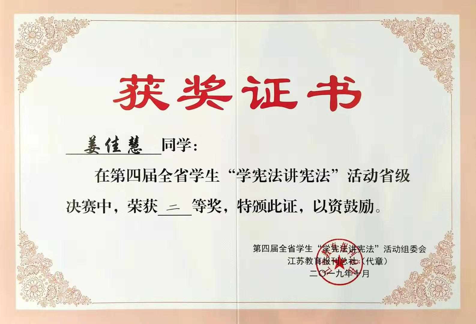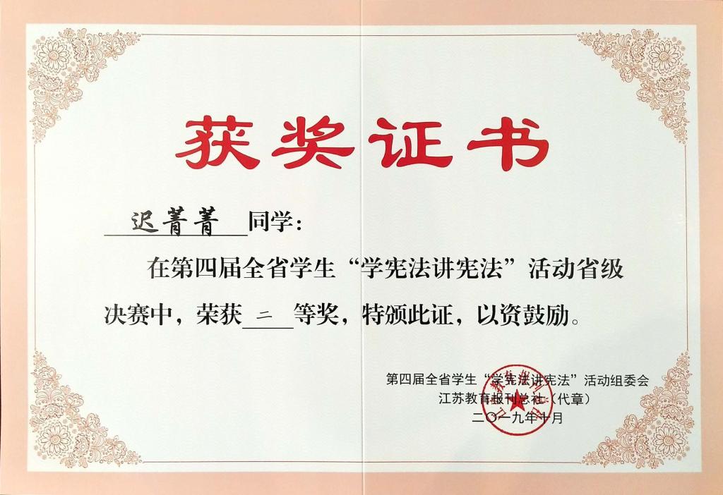10月26日-27日,由江苏省教育厅主办,江苏教育报刊总社承办,江苏警官学院协办的第四届全省学生“学宪法讲宪法”活动省级决赛在江苏警官学院举行。本次活动以“尊崇宪法、学习宪法、遵守宪法、维护宪法、运用宪法”为主题,分为演讲比赛和法治知识竞赛,来自全省54所学校的95名选手参赛,法学院2017级法学专业姜佳慧同学和2018级法学专业迟菁菁同学以苏锡常通片区赛一等奖的成绩代表片区参加了此次比赛并分别获得了省级决赛二等奖。