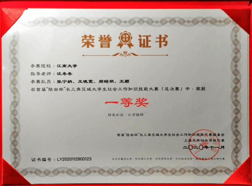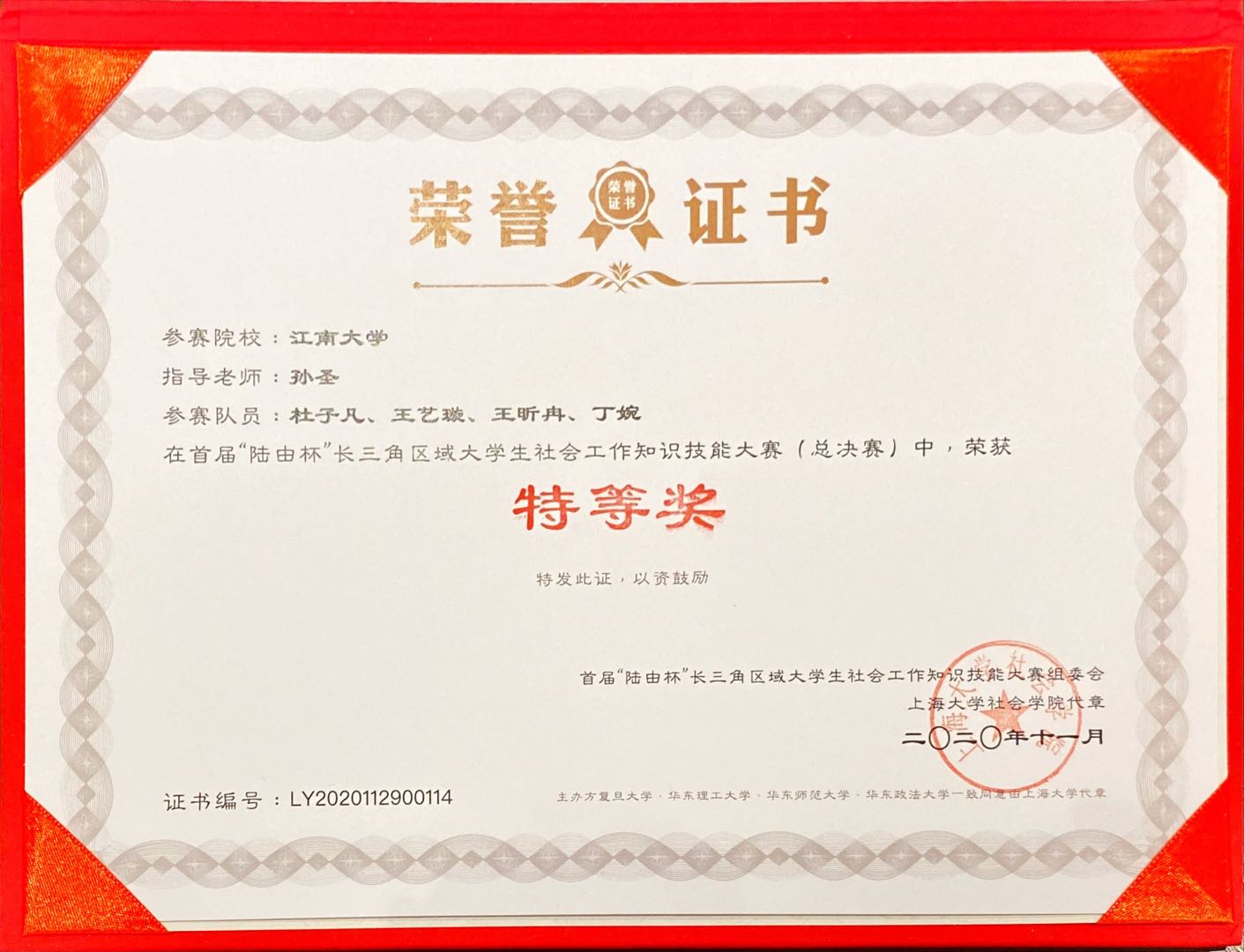 11月28日—29日,由上海大学社会学院、复旦大学社会发展与公共政策学院、华东理工大学社会与公共管理学院、华东师范大学社会发展学院、华东政法大学社会发展学院主办,上海大学社会学院、上海积途信息科技有限公司承办的首届“陆由杯”长三角区域大学生社会工作知识技能大赛总决赛在上海大学宝山校区举行。经过一二轮阶段的比赛,长三角区域共有20支队伍参与总决赛,我校法学院孙圣、汪冬冬老师指导的两支队伍进入总决赛并分别获得特等奖和一等奖。