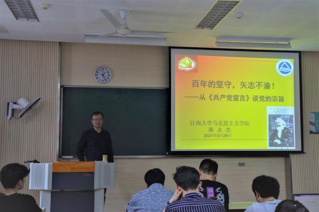 为庆祝建党100周年,响应党中央在全党开展党史学习的号召,5月26日下午,法学院在二教2B202举行“百年坚守:从《共产党宣言》谈党的宗旨”主题讲座。本次讲座由马克思主义学院教授陈永杰主讲,法学院青年学生骨干、少数民族学生骨干组成的青马工程全体学员参与。