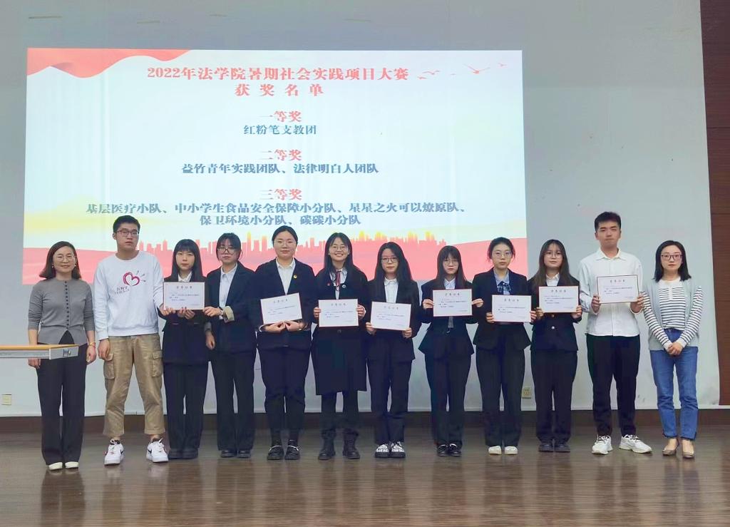 接下来,进行2022年暑期社会实践项目大赛颁奖暨成果展示环节。法学院红粉笔支教团坚守“红心筑梦,粉笔传爱”的理念,将青春志愿的火种播撒到大山深处,为乡村振兴贡献蓬勃力量,荣获一等奖;益竹青年实践团队聚焦乡村干部建设、大学生返乡创业机制等热点话题,助力形成科学的大学生返乡支持体系;“法律明白人”团队,聚焦农民环境权益问题,调研村民委员会作为环境公益诉讼的主体的普遍性问题,两支团队荣获二等奖;基层医疗小队、中小学生食品安全保障小分队、星星之火可以燎原队、保卫环境小分队、碳碳小分队荣获三等奖。8支优秀社会实践团队分享了宝贵经验,展现了法学院学子聚焦基层、关注民生的独特角度,给2022级新生树立了勇担社会责任、展现青年风采的榜样。