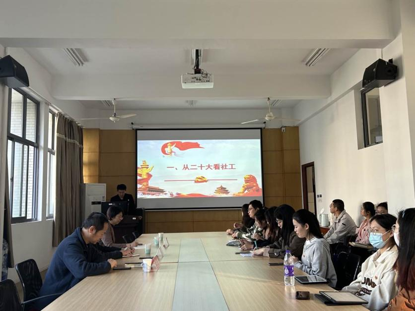 首先,郭雨东开门见山,结合党的二十大报告中对社会工作提出的要求,进行了“从二十大看社工”主题分享。从“增进民生福祉,提高人民生活品质” “健全基本公共服务体系,提高公共服务水平”展开。随后的答题环节中,同学们纷纷摩拳擦掌起立作答,学习效果良好,真正做到了入脑入心。